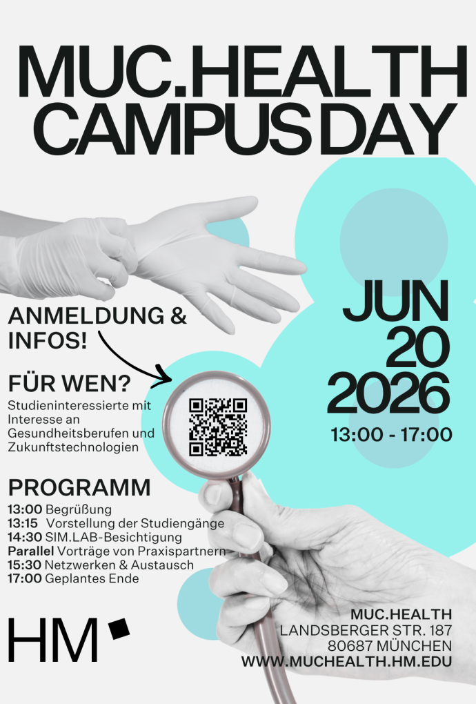 Am MUC.HEALTH Campus Day lernen Sie den neuen Standort der Hochschule München kennen. Informieren Sie sich über unsere Studiengänge. Erfahren Sie von uns, was Sie für Ihr Studium im Bereich Gesundheit, Pflege, Management und Technik wissen wollen.